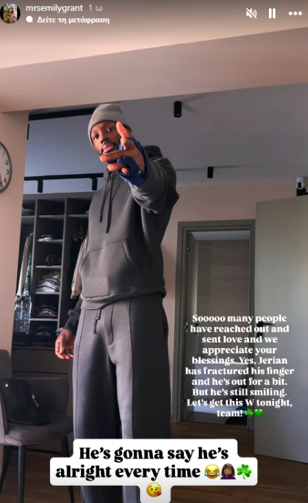 Η σύζυγος του Τζέριαν Γκραντ, Έμιλι, δημοσίευσε ένα Instagram Story στο οποίο ο Αμερικανός γκαρντ δείχνει το δεμένο του δάχτυλο. Το χαμόγελό του δεν έκρυψε την πραγματικότητα: ο παίκτης των «πράσινων» έχει υποστεί ρωγμώδες κάταγμα στο 4ο μετακάρπιο του αριστερού χεριού.