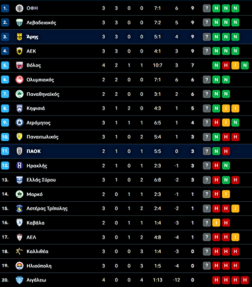 H ομάδα του Βόλου έχει συγκεντρώσει επτά βαθμούς σε τέσσερις αγώνες, δείχνοντας επιθετική διάθεση με δέκα γκολ υπέρ. Στην ίδια ζώνη βαθμών βρίσκονται και οι Ολυμπιακός, Παναθηναϊκός και Άρης, με τους «πράσινους» να έχουν δύο νίκες σε ισάριθμα ματς και θετικό πρόσημο στη διαφορά τερμάτων (+2).