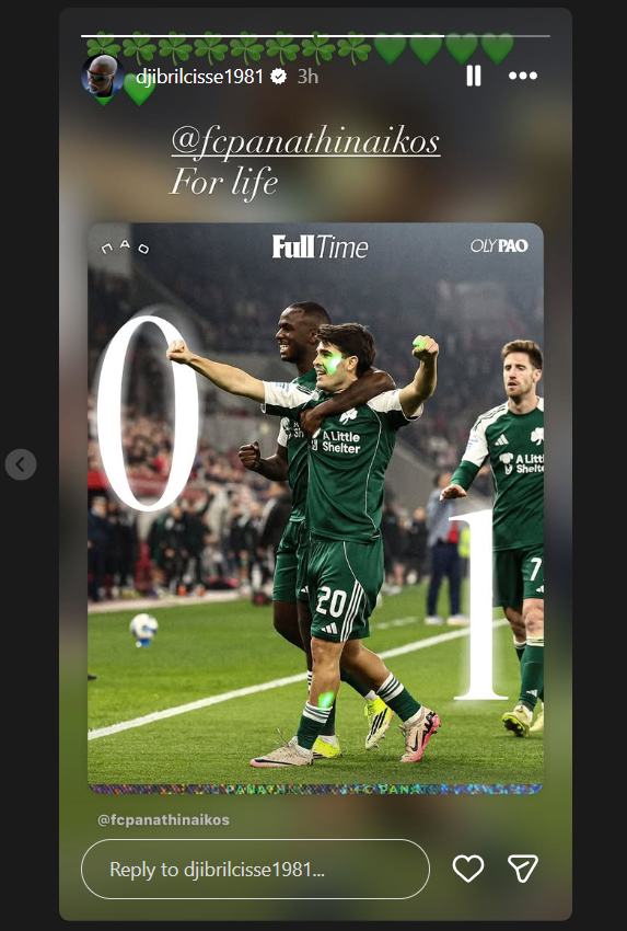 Άμεσα ο Τζιμπρίλ Σισέ πανηγύρισε μέσω Instagram τη σημαντική επιτυχία του Παναθηναϊκού, συνεχίζοντας μια συνήθεια που κρατάει χρόνια. Ο Γάλλος πρώην επιθετικός παραμένει ένας από τους πιο ένθερμους υποστηρικτές του συλλόγου και το δείχνει σε κάθε ευκαιρία.
