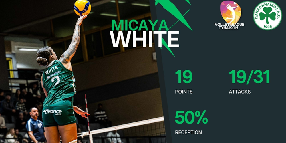 Με εντυπωσιακή εμφάνιση απέναντι στον ΠΑΟΚ, η Μικάγια Γουάιτ αναδείχθηκε MVP της 6ης αγωνιστικής στη Volley League Γυναικών, χαρίζοντας στο «Τριφύλλι» το απόλυτο 6Χ6 στο πρωτάθλημα. Η Αμερικανίδα ακραία έδειξε την ποιότητά της και επιβεβαίωσε γιατί θεωρείται μία από τις πιο δυνατές μεταγραφές του καλοκαιριού.