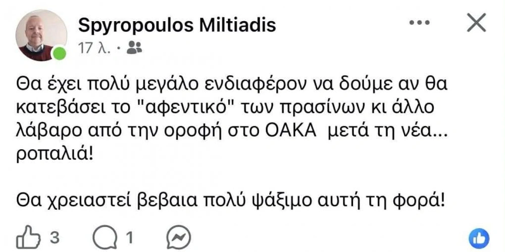 «Θα έχει πολύ μεγάλο ενδιαφέρον να δούμε αν θα κατεβάσει το «αφεντικό» των πρασίνων κι άλλο λάβαρο από την οροφή στο ΟΑΚΑ μετά τη νέα... ροπαλιά! Θα χρειαστεί βέβαια πολύ ψάξιμο αυτή τη φορά!».
