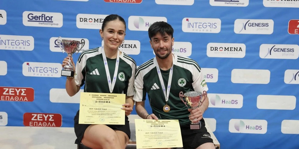 Ο Γιώργος Κωνσταντινόπουλος και η Ιωάννα Γερασιμάτου αναδείχτηκαν το μεσημέρι του Σαββάτου (21/03) πρωταθλητές Ελλάδας του διπλού μικτού ανδρών-γυναικών στην επιτραπέζια αντισφαίριση για την περίοδο 2025-2026.